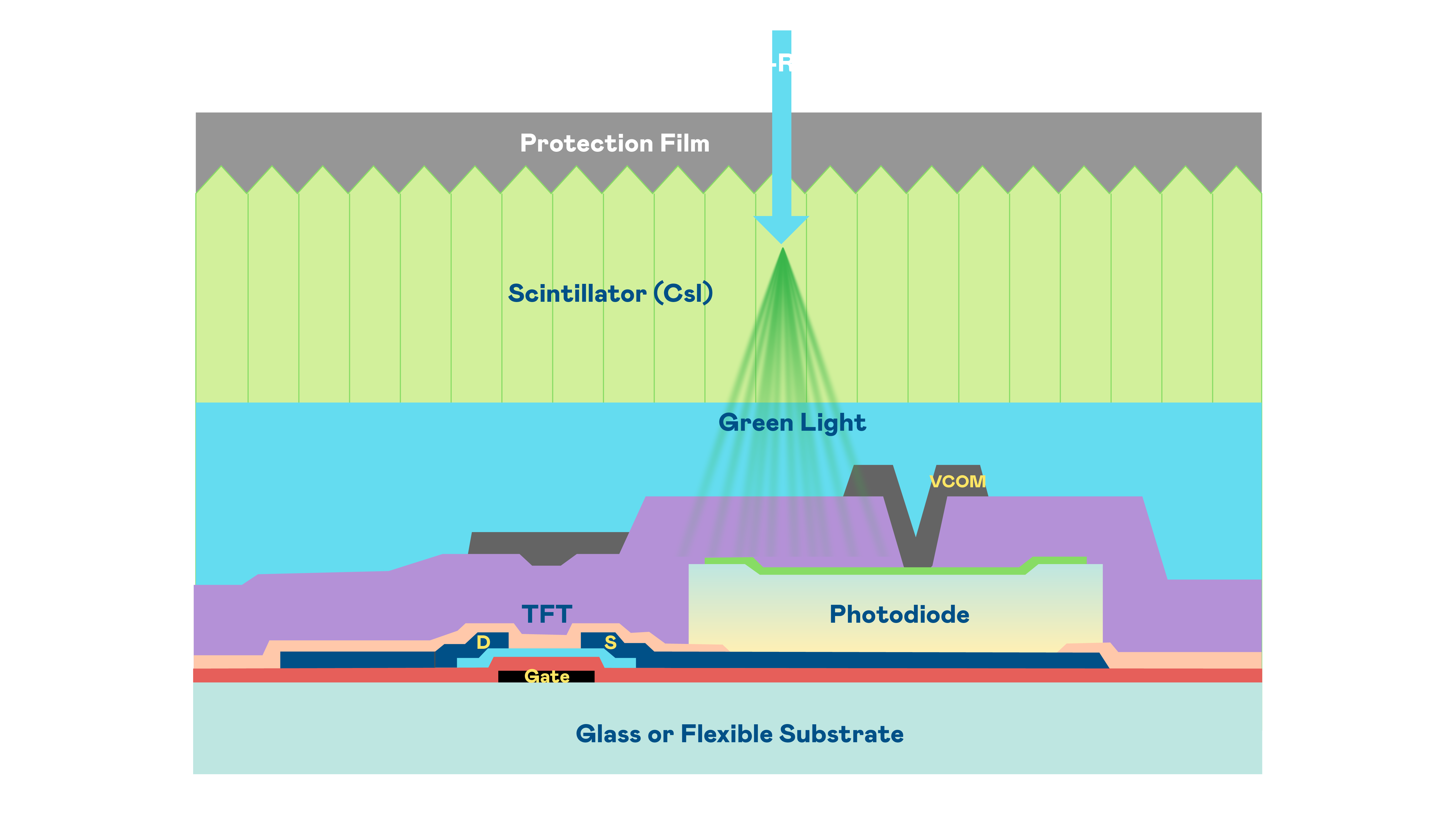 金年会- 金字招牌的X光影像感测阵列使用薄膜电晶体 (TFT) 作为每个像素的读取开关,搭配光电二极体(Photodiode)的光电转换元件,用以感测X光影像讯号。